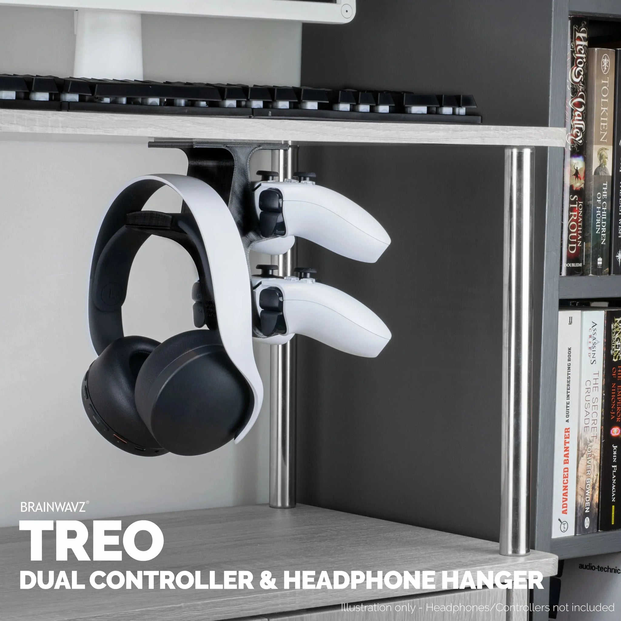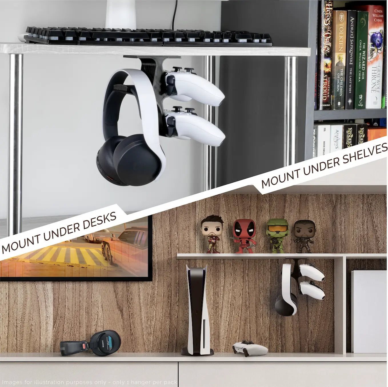 Hang all your controllers and headphones neatly and conveniently out of the way, preventing damage and keeping your game-space clutter free and organized.
